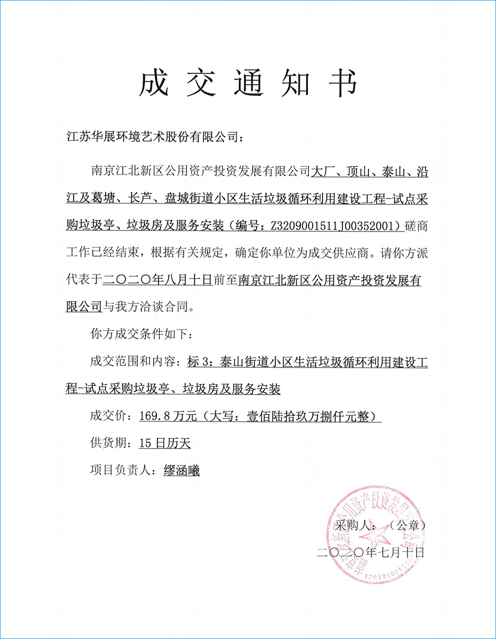 【中標(biāo)通知】江蘇省南京江北新區(qū)大廠、頂山、泰山、沿江及葛塘、長(zhǎng)蘆、盤(pán)城街道小區(qū)生活垃圾循環(huán)利用建設(shè)工程-試點(diǎn)采購(gòu)垃圾亭、垃圾房及服務(wù)安裝項(xiàng)目